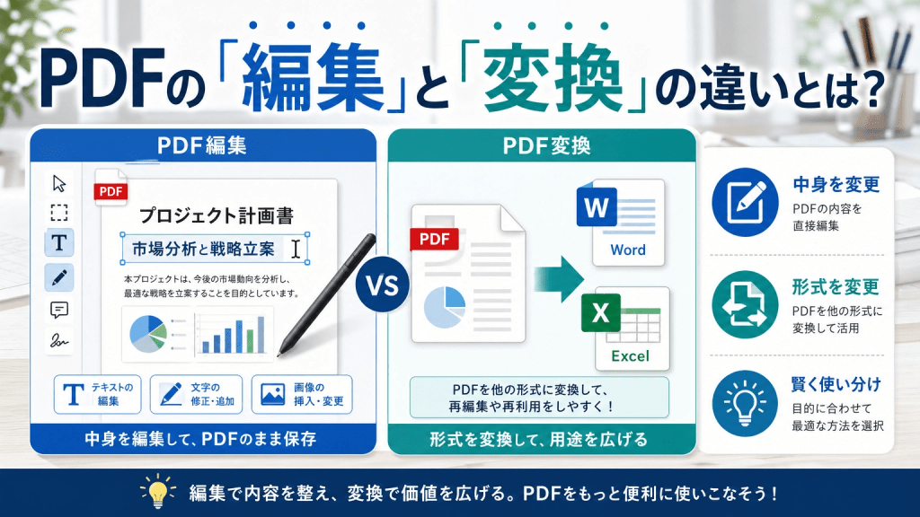 PDF編集と変換は似ているようで役割がまったく異なります。それぞれの違いを理解し、目的に応じて使い分けることで、作業効率と成果の質が大きく向上します。